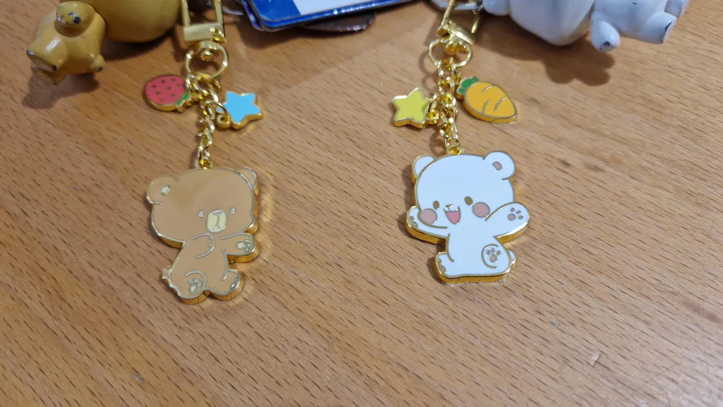 - All metal keychain with gold mirror finish on the side and detailing, textured matte on the back with milkmochabear logo.
